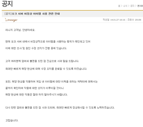 엔씨소프트 측은 “오크 서버 내에서 비정상적으로 아이템을 사고 파는 행위가 확인되고 있어 이에 대한 조사 및 원인 수정 조치가 진행 중”이라며 “해당 현상을 악용해 이득을 취한 캐릭터에 대해서는 끝까지 확인해 조치를 취하겠다”고 전했다.