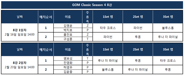 GOM eXP는 지난 1월 29일부터 2월 5일까지 일주일 간 GOM 클래식 시즌 4에 사용될 맵을 선정하기 위한 시청자 투표를 진행했다. 투표 결과 시청자들로부터 많은 득표수를 얻은 ‘파이썬’, ‘루나’, ‘블루스톰’이 맵으로 선정되었으며 추가적으로 ‘투혼’과 ‘타우크로스’의 맵이 더해진다. 많은 명경기가 탄생했던 5개의 맵에서 다시 한 번 치열한 전투가 펼쳐질 예정이다.