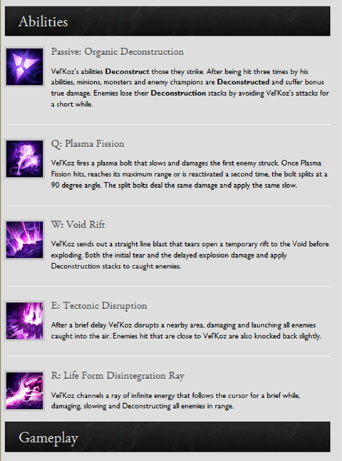 이번에 공개된 벨코즈의 스킬은 소환사들에게 충분히 매력적이다. 패시브 스킬 '유기해체(Organic Deconstruction)'는 세번 공격을 당한 상대 미니언 혹은 챔피언에게 추가 피해를 입힌다. 벨코즈의 공격을 피해야만 해체 수치가 쌓이는 것을 방지할 수 있다.