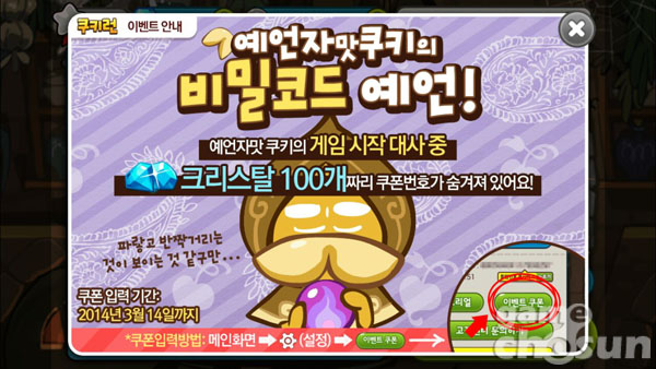 예언자맛 쿠키 업데이트와 함께 해당 캐릭터의 게임 시작 대사 가운데 16자리 비밀 코드를 합치면 캐시아이템인 크리스탈 100개를 증정하는 이벤트도 오는 14일까지 진행한다.