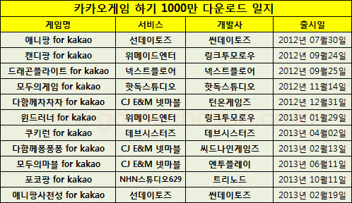 아울러 그간 출시된 1천만 이상 다운로드를 달성한 11종의 게임들은 1천만 다운로드 외에도 각종 진기록을 보여주고 있어 이목을 집중 시킨다.