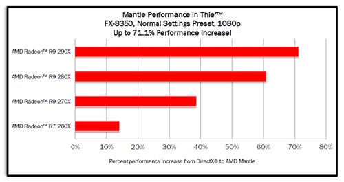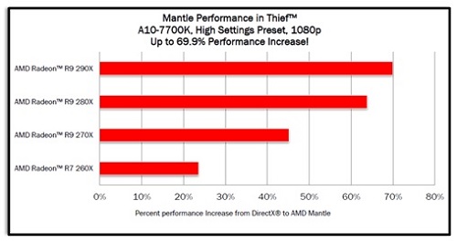 AMD A10-7700K APU, FX 8350 CPU와 AMD 라데온™ R9 290X이 조합된 시스템을 사용하여 맨틀API 기반에서 성능테스트를 진행한 결과, 높음 그래픽 옵션 설정 시, DirectX 보다 무려 70%가량 높은 초당 프레임을 기록했다.