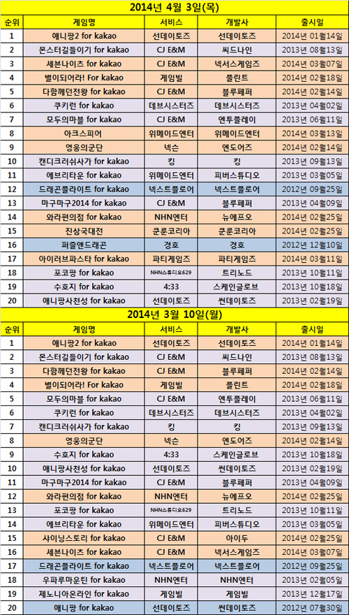 모바일 캐주얼 게임의 대명사였던 '애니팡'도 출시 이후 처음으로 게임부문 매출순위에서 20위권 밖으로 밀려나며 하락세를 보이고 있다.