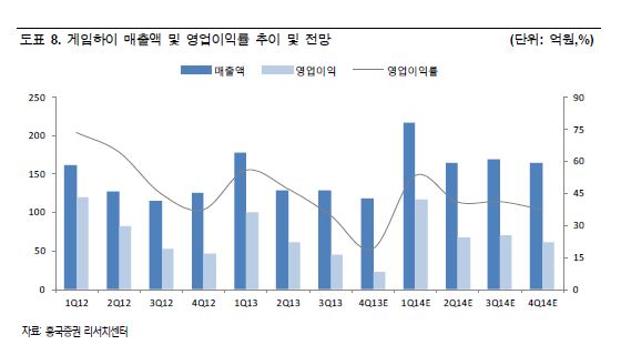 유 애널리스트는 "넥슨GT는 '서든어택' 트래픽 증가, 신규 모바일게임 출시, 넥스토릭 합병 등으로 2014년 전년대비 29.4% 늘어난 715억원의 매출과 38.5% 증가한 316억원의 영업이익을 낼 것으로 보인다"며 "또 내년에는 '서든어택' 후속 FPS 게임 매출이 반영되면서 성장추이가 지속될 전망"이라고 전했다.