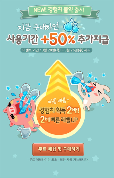 경험치 물약은 게임 내 경험치 획득량을 두 배로 늘려주는 아이템으로 토파즈(캐쉬)를 통해 구매할 수 있다.