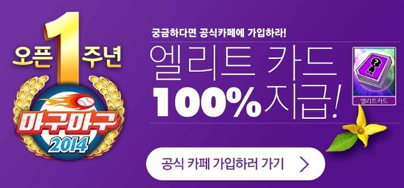이번 이벤트는 '마구마구2014'의 출시 1주년을 맞아 진행되는 것으로 9일 공개되는 시간에 접속하는 유저들에게 엘리트 등급의 카드를 증정한다.