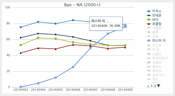 ▲ 4.5 패치 이후 북미서버에서 급격한 밴률의 상승을 보이고 있는 마스터 이(출처 : fow.kr)