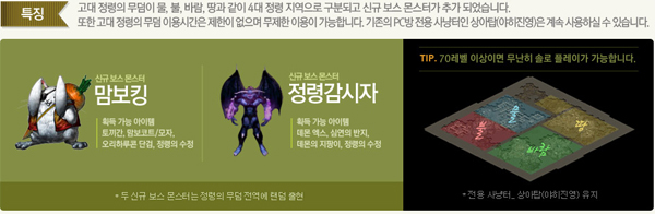 이 사냥터는 수상한 하늘 정원을 통해 입장할 수 있으며 물, 불, 바람, 땅 4대 정령 지역으로 구분되고 신규 보스 몬스터 '맘보킹'과 '정령감시자'가 추가됐다.