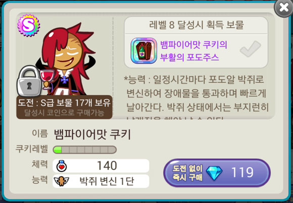 뱀파이어맛 쿠키는 장애물에서 주스 방울을 추출해 체력을 회복하고, 일정 시간 마다 포도알 박쥐로 변신하는 능력을 지니고 있다.