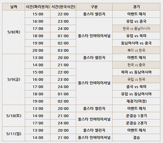 먼저 오는 8일 한국시간으로 22시부터 올스타 챌리지가 1시간 동안 진행되고 이어 23시부터 유럽vs중국, 한국vs동남아시아, 유럽vs북미, 동남아시아vs중국, 북미vs한국 등의 경기가 1일차에 진행된다.
