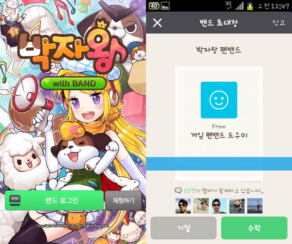 또한 게임 접속 후 밴드를 학인해보면 게임 팬밴드 도우미라는 신규 밴드가 생성되고 수락할 경우 해당 밴드에서 게시글이나 사진업로드 댓글 등 커뮤니티 활동이 가능하다.