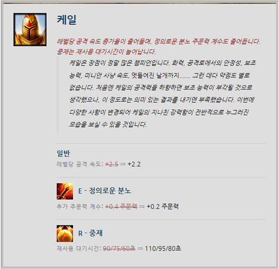이에 라이엇은 레벨 당 공격속도 증가와 정의로운분노의 주문력 계수 감소, 중재의 재사용 대기시간 증가를 통해 케일의 밸런스를 맞추고자 했다.