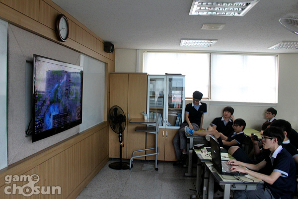 ▲ 교실에 배치된 TV로 e스포츠 진로체험 행사를 관람하는 학생들