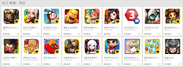 25일 구글 플레이마켓 게임 부문 최고 매출 순위에 따르면 1-2-3위는 '블레이드와 몬스터길들이기-애니팡2' 등 카카오 게임하기 플랫폼의 게임이 굳건한 순위를 유지 중이지만 4위부터는 '클래시오브클랜'을 비롯해 비(非) 카카오 진영 게임이 눈에 띈다.
