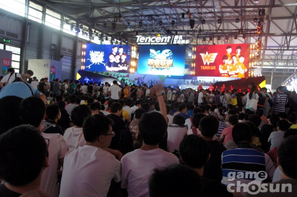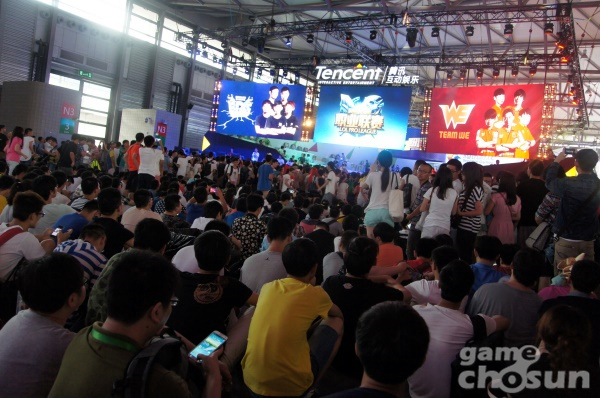 실제로 이 두 회사의 부스는 차이나조이 행사기간 중 내내 발 디딜틈 없는 성황을 이뤘다. 'LOL 프로리그'가 진행되는 시간이면 텐센트 부스 앞에는 누가 먼저랄 것도 없이 관람객들이 이벤트홀 앞에 줄지어 앉았다. 어림잡아도 500여명은 족히 넘어 보이는 인원이 삽시간 내에 모여 들었다.