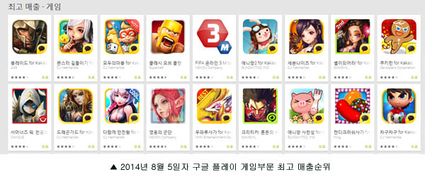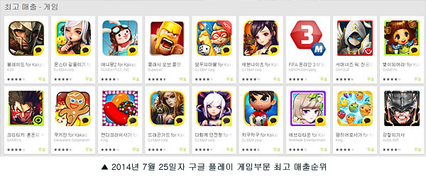 '브라질월드컵' 특수의 최대 수혜자인 넥슨의 '피파온라인3M by EA스포츠'가 그 뒤를 이으며 1-3위를 유지하던 선데이토즈의 '애니팡2'는 6위로 자리이동을 했다.