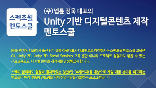 스펙초월멘토스쿨은 '넥슨프로야구마스터'와 '전설의터치헌터'로 영향력을 보여준 정욱 넵튠 대표가 '유니티기반 디지털콘텐츠 제작과정'을 담당, 유니티개발을 위한 교육 뿐만 아니라 프로젝트 진행 노하우까지 전수할 계획이다.