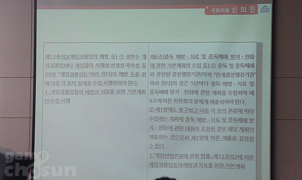 신 의원은 이날 인사청문회에서 "김 후보자는 '게임중독법'과 '게임산업진흥에 관한 법률(게임법)'이 상충하는 부분이 있다고 주장했는데, 게임법이 게임중독법을 갈음할 수 있다고 생각하느냐"고 물으며 두 개 법률안의 일부 발췌한 자료를 공개했다.