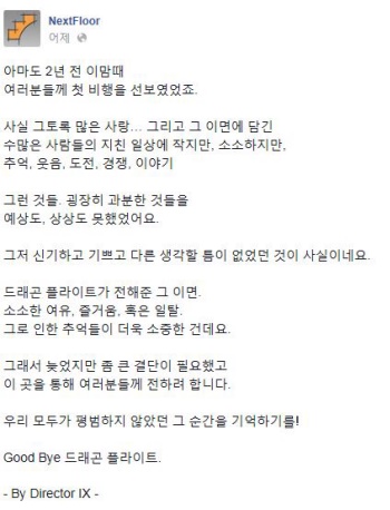 실제 회사 측은 이날 페이스북을 통해 "늦었지만 큰 결단이 필요했고, 이 곳을 통해 전하려 한다"며 "우리 모두가 평범하지 않았던 그 순간을 기억하기를, Good Bye 드래곤 플라이트"라는 글을 남겼다.