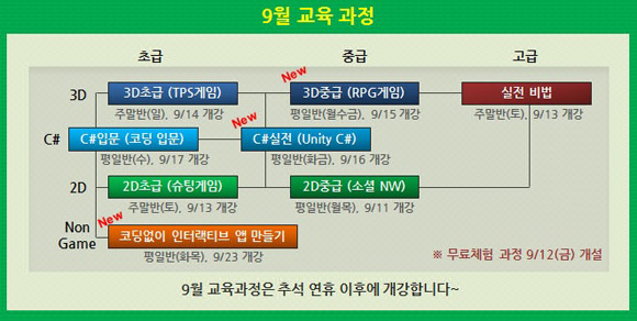9월 유니티 엔진 교육과정은 C#초급부터 C#중급, 2D초급, 2D중급, 3D초급, 3D중급, 3D고급과정까지 완벽하게 준비 되어 있고 이번 달부터 RPG 제작 과정, Non-game 분야 강좌, C# 중급과정 등이 새롭게 개설 된다.