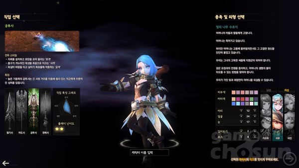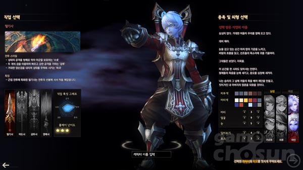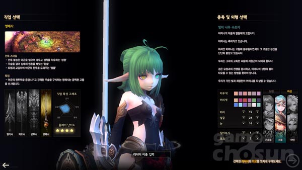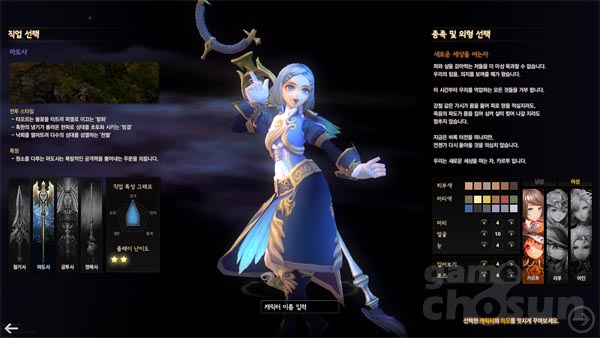 이번 테스트에서 선보인 캐릭터 선택 창에서 엘로아가 준비한 4종의 직업을 확인할 수 있었다. FGT 현장에서 공개된 4종의 직업은 혈기사와 마도사, 궁투사, 영매사로 확인됐다.