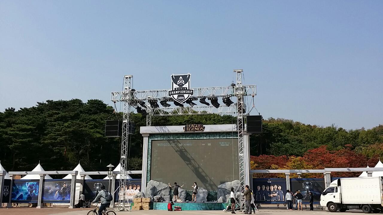 월드컵경기장 주변은 롤드컵을 하루 앞두고 사전 커뮤니티 행사 준비에 여념이 없이 분주한 모습이다.