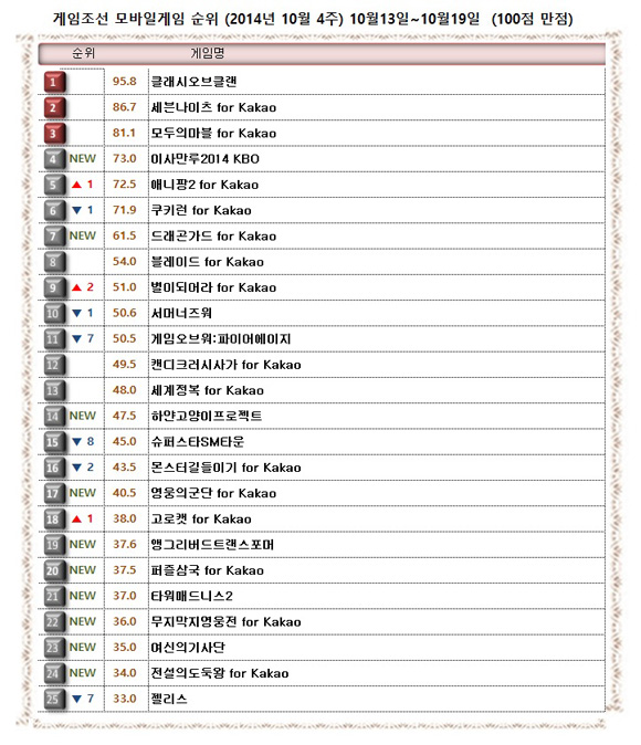 10월 4주(2014년 10월 13일 ~ 2014년 10월 19일) 게임조선 모바일게임 순위입니다.