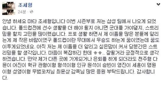 조세형은 해당 글에서 "이번 시즌부로 삼성에서 나오게 됐다. 롤드컵 전에 선수생활을 더 해야 될 지 아니면 군대를 가야될 지 스트리밍을 할 지 고민을 많이 했다"며 말문을 열었다.