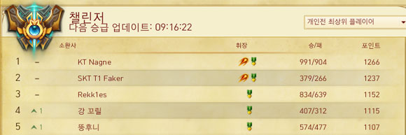 많은 게이머들이 보다 높은 랭크를 기록하고자 혈전을 펼쳤고, 10일 오후 4시 현재 한국 라이브 서버의 1위 다툼은 사실상 두 명으로 좁혀졌다. 그 주인공은 바로 세계 최고의 선수로 불리는 '페이커' 이상혁과 KT롤스터의 미드라이너 '나그네' 김상문이다.