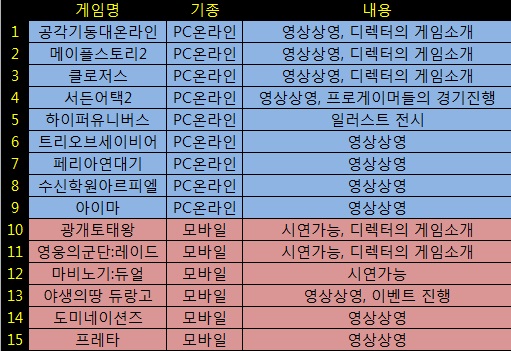 시연 버전이 공개되는 게임은 모바일게임 '마비노기:듀얼', '영웅의군단:레이드', '광개토태왕' 이상 3종이다. ‘서든어택2’의 경우는 부스에서 프로게이머들의 경기가 펼쳐진다.