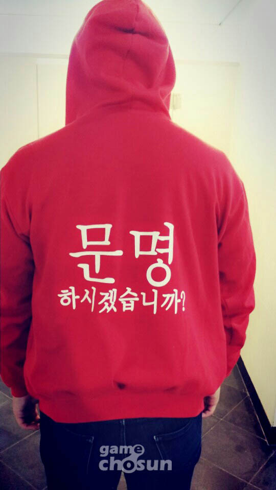 한편 엑스엘게임즈 현장 관계자는 붉은색 후드를 착용하고 있는데 뒷면에는 문명 시리즈 최고의 유행어인 '문명하셨습니다'를 패러디한 '문명하시겠습니까?'라는 글자가 새겨져 있다.