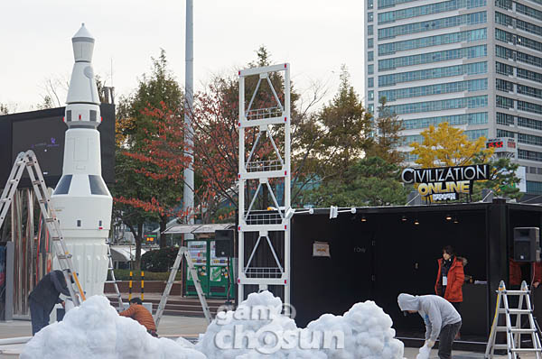 문명온라인의 대표적 콘텐츠 가운데 하나인 우주개발을 상징하는 로켓 모형을 야외 부스에 설치해 관람객들의 이목을 끌겠다는 각오로 보인다.