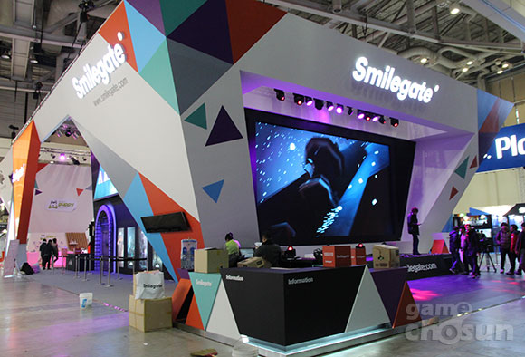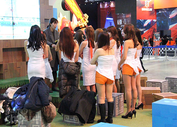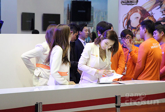 ▲ 관람객 맞을 준비 중인 스마일게이트의 부스걸들