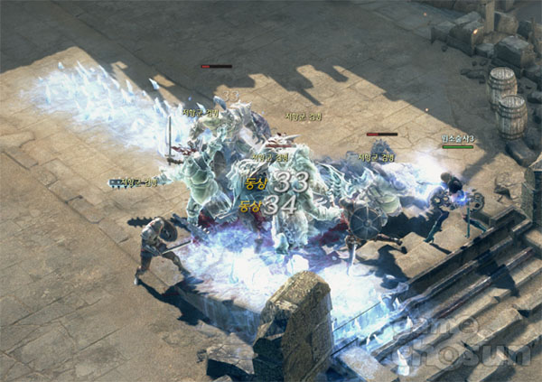 바로 여기서 다른 유저들과의 멀티 플레이로 자연스럽게 이어진다. 보스 몬스터 팝 위치로 가면 화면 우측에 기존에 없던 레이드 UI 가 생겨난다. 현재 레이드에 참가하고 있는 유저들의 피해량을 측정하는 일종의 기여도 게이지. 1위부터 4위까지, 그리고 현재 자신의 순위를 볼 수 있다. 특히, 시연 버전에서는 조건을 만족시켜야만 보호막이 해제되는 식으로 보스를 쓰러뜨리기 위한 소소한 공략까지도 요구하는 것을 볼 수 있다.