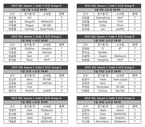 GSL 코드S는 매주 수요일과 금요일 오후 6시 30분 곰eXP 스튜디오에서 생방송된다. 오는 7일 개막전을 치르는 32강 A조에는 장민철(MC, 무소속), 남윤석(SK Telecom T1_PenguiN), 이병렬(Jin Air Green Wings_Rogue), 정명훈(Dead Pixels_FanTaSy)이 출전한다.