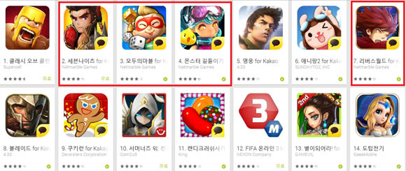 그 밖에도 네시삼십삼분은 '영웅 for Kakao'와 '블레이드 for Kakao'를 구글 게임 부문 매출 Top10에 진입 시켜 넷마블 뒤를 매섭게 추격하고 있고 넥슨, NHN엔터테인먼트, 위메이드엔터테인먼트, 게임빌의 대표 카톡게임들도 구글 게임 부문 매출 상위권을 기록 중이다.