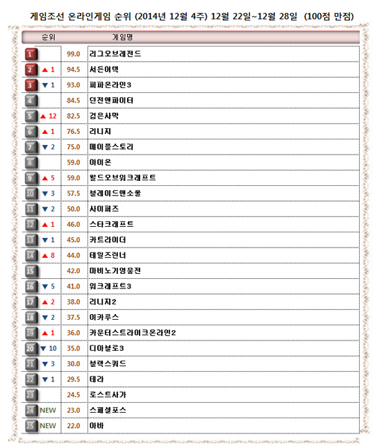 12월 4째 주(2014년 12월 22일 ~ 2014년 12월 28일) 온라인게임 순위입니다.