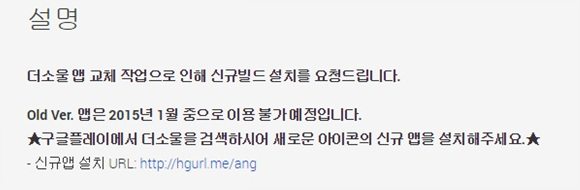 현재 '더소울' 구버전 페이지를 보면 제목 옆에 'Old Version'(구버전)이라는 문구가 추가됐고, 소개 내용에는 "더소울 앱 교체 작업으로 인해 신규빌드 설치를 요청드립니다. 구버전은 2015년 1월 중으로 이용 불가 예정입니다"라고 되어있다.