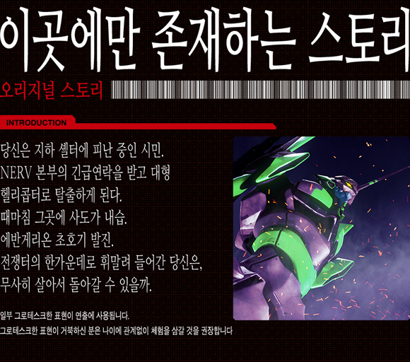기본적인 설정은 관람객들이 '에반게리온'의 민간인이며, 피신을 위해 대형 비행기에 탑승한 상태에서 '신지'가 탑승한 '초호기'와 중간에 등장한 '사도' 간의 전투를 바라보는 것이다. 영상에는 '신지', '레이', '아스카', '사도' 등이 등장한다.