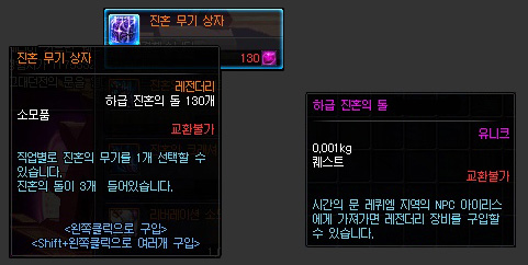 또, 기존의 진:고대 던전에서 구할 수 있었던 레전더리 등급의 장비 ‘진혼의 무기’를 일반 고대 던전에서도 획득할 수 있도록 변경된다. 고대던전에서 획득할 수 있는 ‘하급 진혼의 돌’을 모아 아이리스가 판매하는 ‘진혼의 무기 상자’를 구매할 수 있으며, 해당 상자에서 원하는 종류의 무기를 선택할 수 있다.