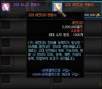 이외에도 기존의 고대던전 레전더리 아이템의 레벨이 낮아 최대 레벨 유저가 사용하기 어려웠던 점을 개선해 모든 고대던전 관련 레전더리 아이템을 85레벨로 상향했으며, 기존의 고대던전 레전더리 아이템은 (구)아이템으로 변경, 해당 아이템을 업그레이드할 수 있도록 개선됐다.