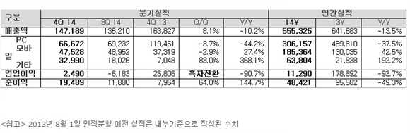 2014년 연매출은 5,553억원을 기록해 전년 6,416억 원 대비 13.5% 감소했으며, 영업이익은 112억원으로 전년 1,788억 대비 93.7% 감소했다. 당기순이익은 484억원으로 전년 955억원 대비 49.3% 감소했다.