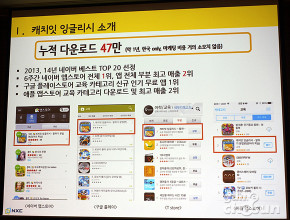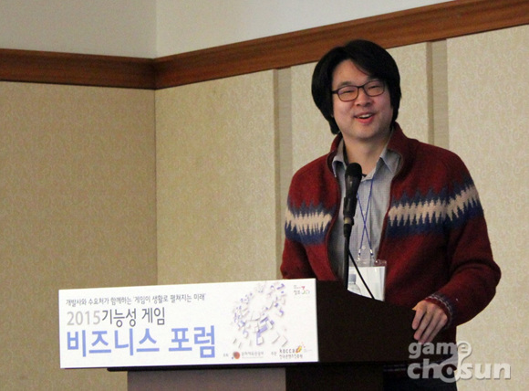최원규 NXC(넥슨 지주회사) 팀장은 10일 서울 코엑스에서 개최된 '2015 기능성게임 비즈니스 포럼'에 참가해서 영어학습 기능성게임 '캐치잇잉글리시'의 개발과정과 개발후기, 그리고 출시 후 각종 지표에 대해 발표했다.