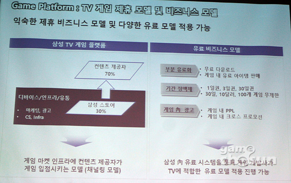 김영찬 상무는 "수익 분배의 기본 방침은 삼성 30% 개발사 70%이지만 이 비율은 경우에 따라서 유연하게 적용할 수 있다"며 "거기에 부분유료화, 기간 정액제, 게임내 광고 등 다양한 수익모델을 모두 구현할 수 있다"고 말했다.