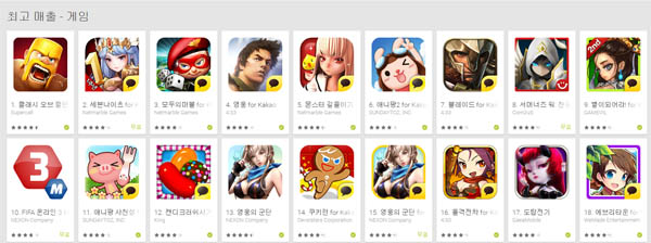 ▲ 2015년 3월 10일 구글 플레이 마켓 게임 부문 최고 매출 순위
