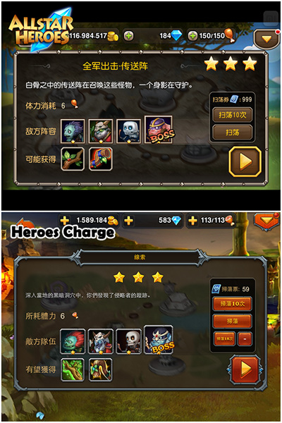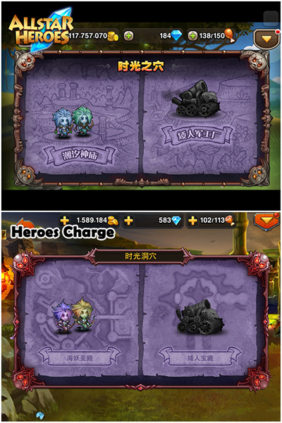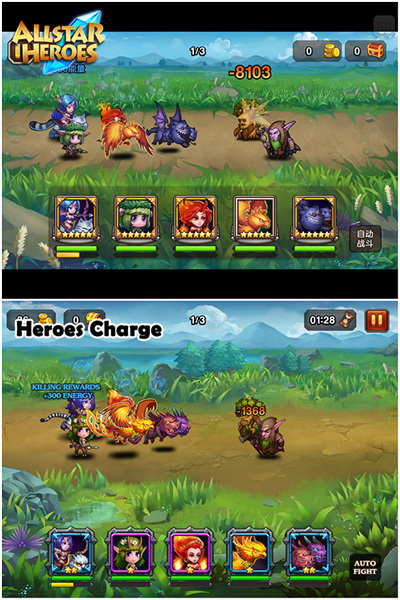 위 화면이 '도탑전기', 아래가 '히어로스차지'(사진 출처는 올스타히어로즈 페이스북)