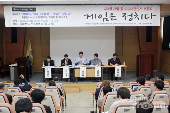 '확률형아이템규제 법안'(정우택 의원이 발의한 게임법 개정안) 등을 주제로 게임 육성-규제에 이야기하는 '게임은 정치다' 토론회가 3월 27일 중앙대학교 아트센터에서 열렸다.