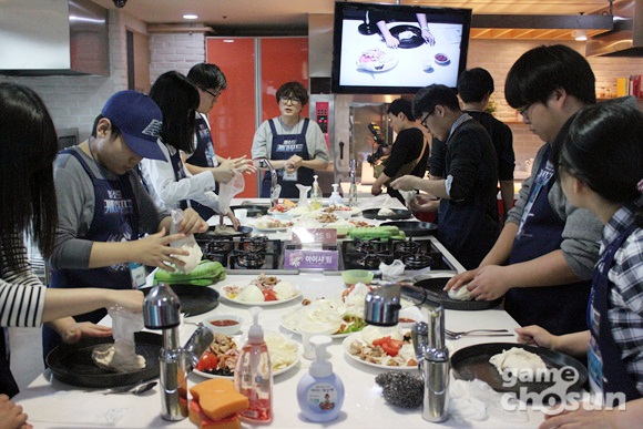 개발자들과 함께 피자를 요리하는 형식으로 진행된 유저간담회, 사진 중앙이 권오당 디렉터