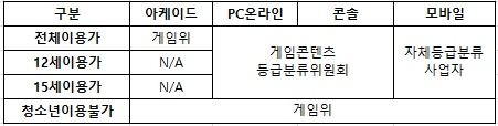 *아케이드게임은 이용등급이 전체이용가와 청소년이용불가 2개밖에 없습니다.
