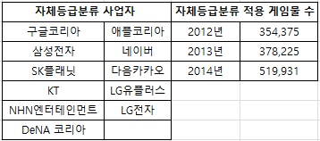 게임위에 따르면, 2015년 3월 기준으로 자체등급분류사업자는 총 11곳이며 적용된 게임물의 수는 2014년 기준으로 총 519,913개에 이르렀다고 합니다.